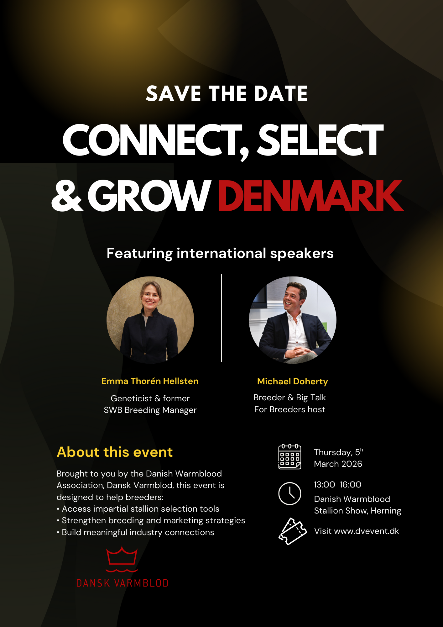 Thanks to the work of Annelise Vestergård, Christel Krøyer and Lene Gadgaard, we are delighted to announce that Connect, Select, & Grow - Denmark will take place on Thursday, 5th March 2026, during the Danish Warmblood Stallion Show in Herning.
