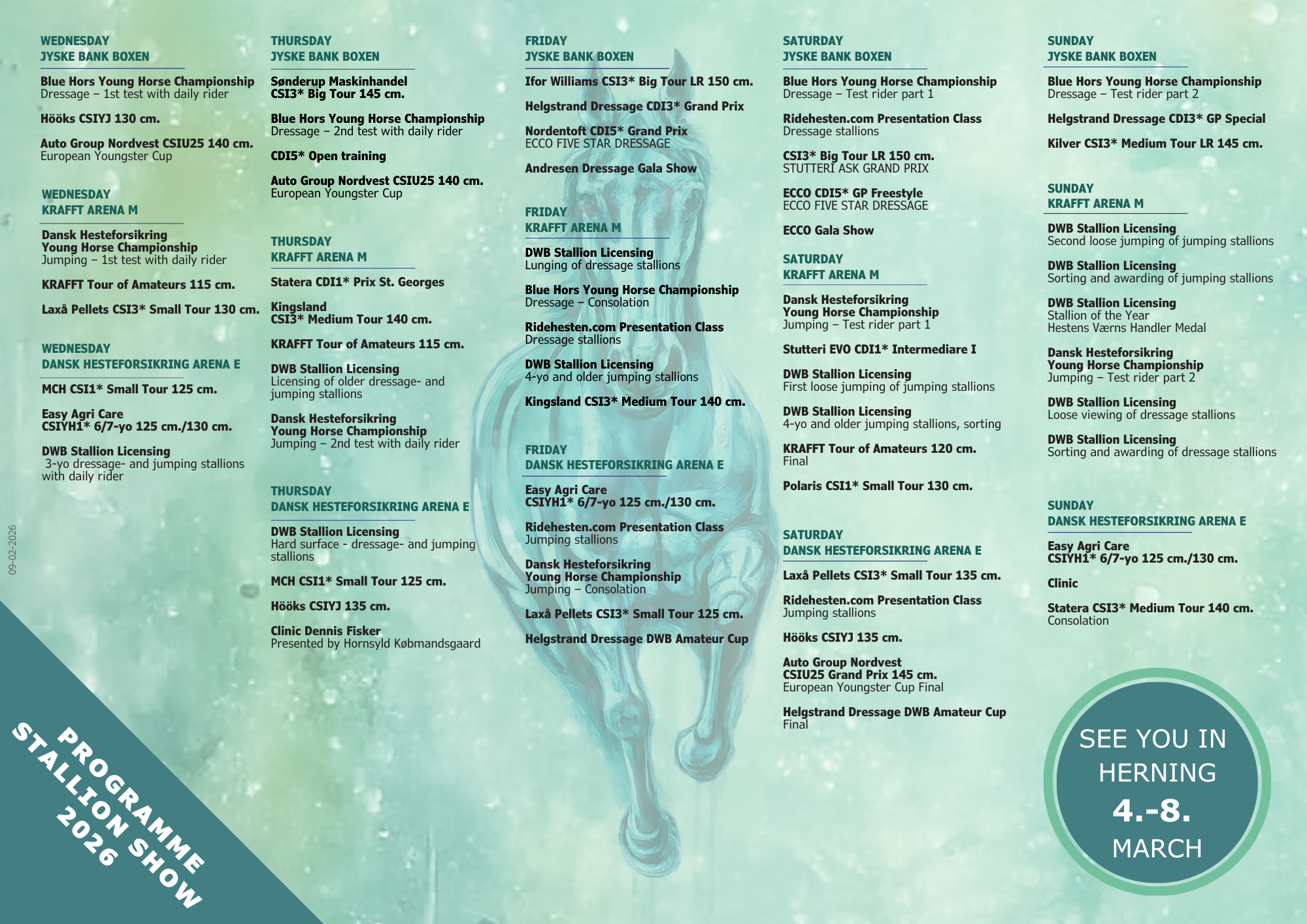 The Danish Warmblood Stallion Show is one of the largest of its kind, attracting more than 60,000 spectators annually. An action packed programme, spanning five days, contains stallion approvals, young horse championships and international showjumping and eventing competitions.